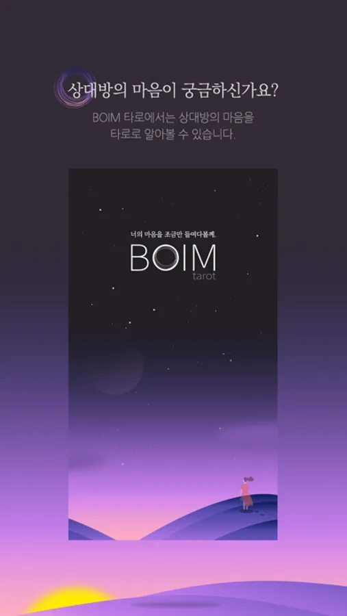 BOIM 타로는 상대방의 마음을 들여다보는 것에 특화된 타로 서비스입니다.