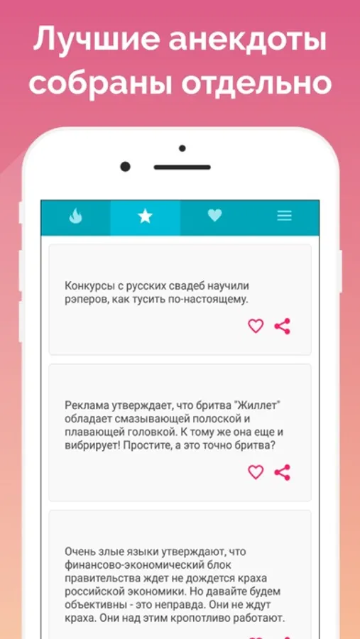 Этот сборник доставит настоящее удовольствие как заядлым любителям анекдотов, так и обычным любителям посмеяться от души. Если вам понравилась шутка, вы можете добавить ее в избранное, чтобы позже опять вернуться к ней. Также у вас есть возможность поделиться анекдотами или отправить в смс-сообщении. Это очень удобно, если вы обожаете поржать вместе с друзьями и повысить настроение даже в самый скучный и пресный день.