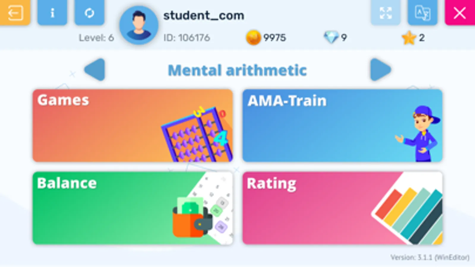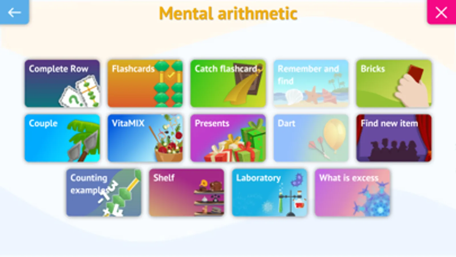 The application implements tasks for Mental Arithmetic, Liberica (speed reading) and Memorica (memory development program).