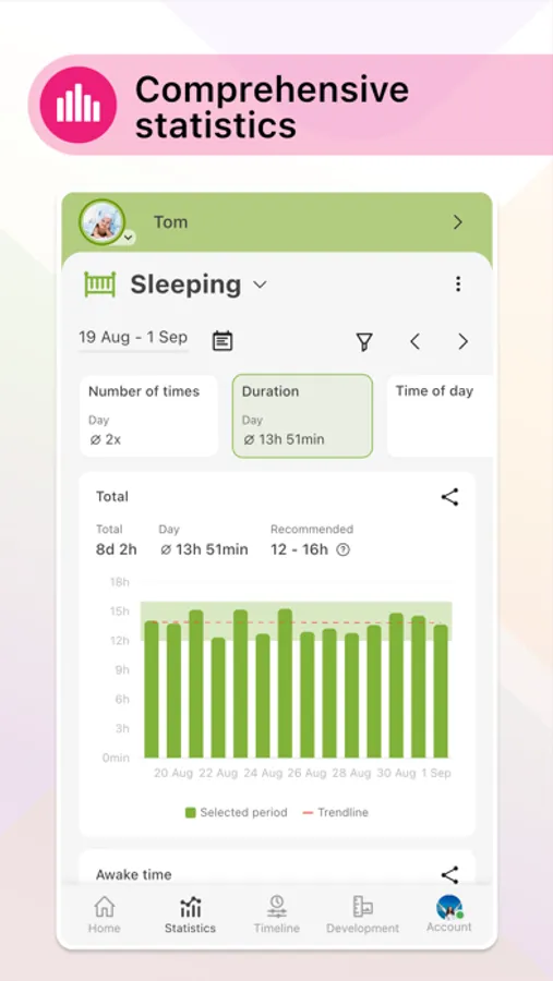 Comprehensive baby activity statistics with sleeping recommendations is like a sleep consultant in your palm.