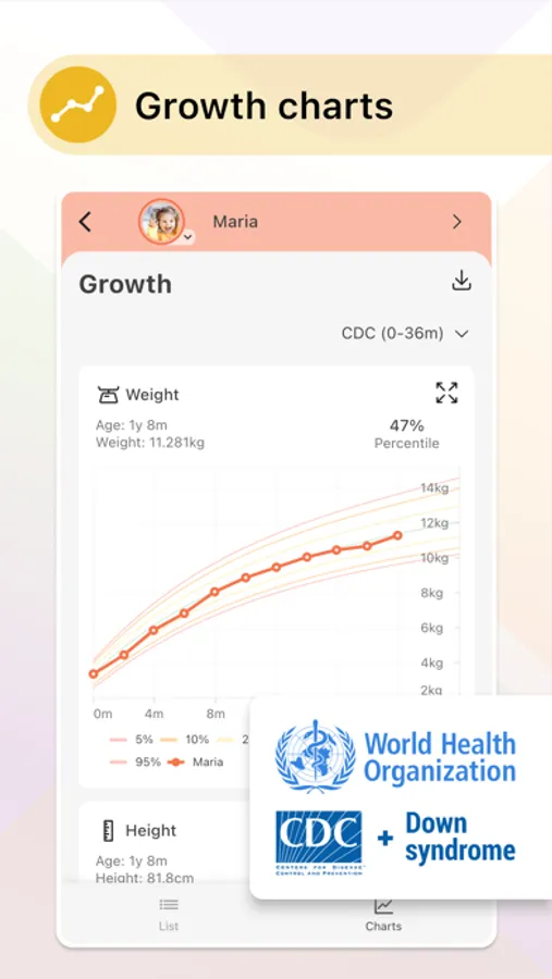 Record your child's weight, height and head circumference and compare them against world averages of CDC and WHO. See the adjusted growth chart for premature babies.