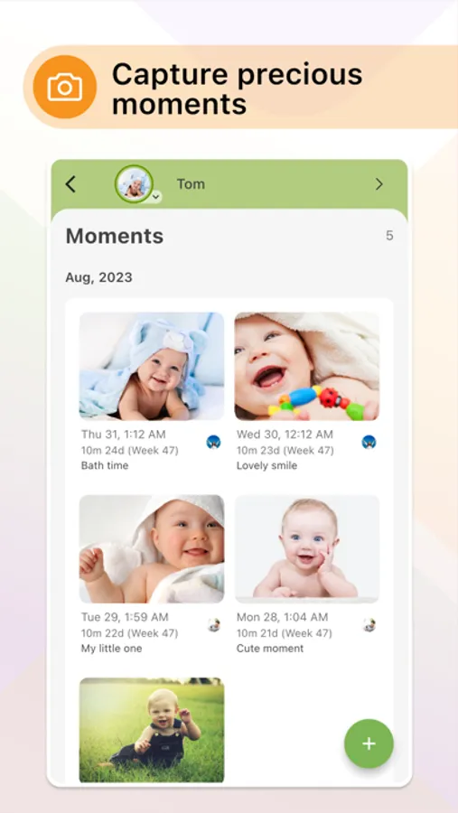 Log baby bath, tummy time, walking outside, playtime and other activities to have a full picture of baby's day.