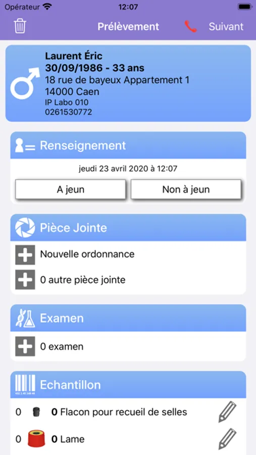 Le guide de prélèvement (pour chaque analyse) est accessible dans le smartphone et mis à jour en temps réel avec le laboratoire.