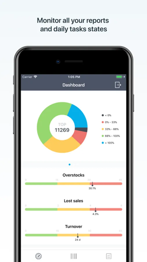 Application shows current tasks of managers, orders information, residues, turnover, surplus and other figures. Presently, reports are available and accessible from a smartphone.
