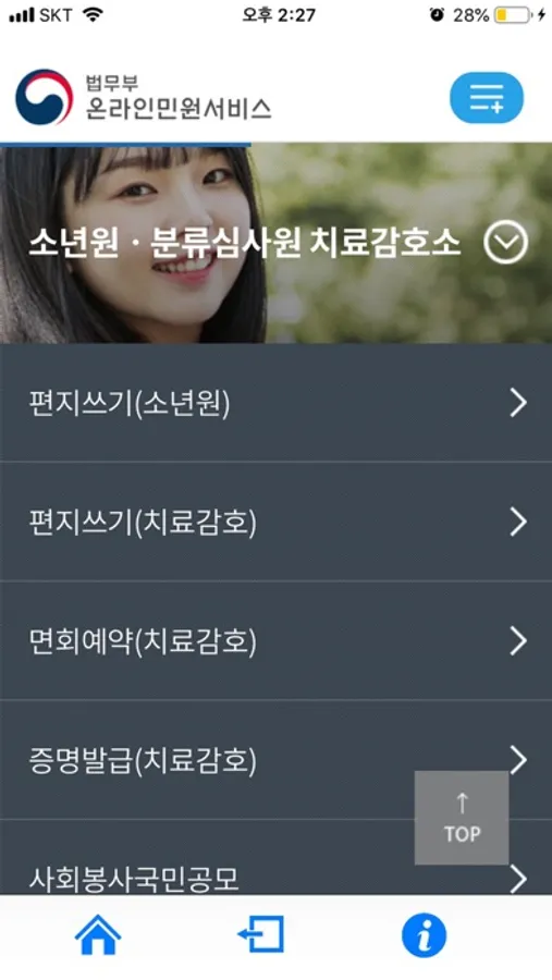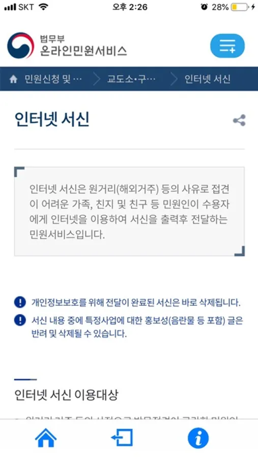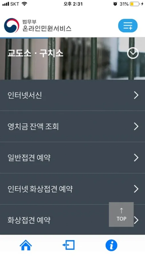 법무부 대표 온라인민원서비스 앱으로 교도소·구치소, 소년원·분류심사원·치료감호소, 사증·출입국·체류·국적, 사법시험·변호사시험 등의 민원관련 서비스를 제공합니다.
