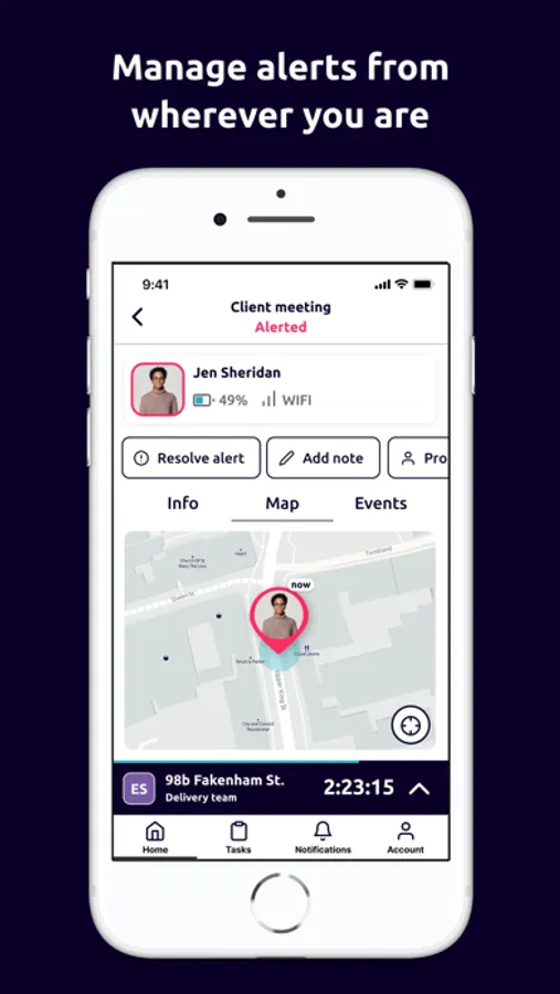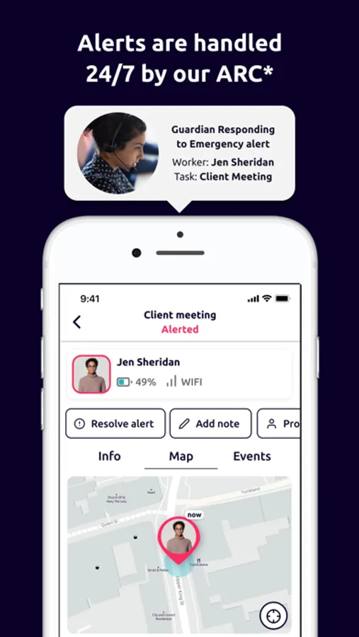 If a staff member runs into trouble, is unresponsive, or has a fall*, an emergency alert is sent out, as well as real-time location and safety data. Emergency responses are handled by our dedicated response team, who are accredited at the highest standards, so you can rest assured that your staff’s safety is in hand.