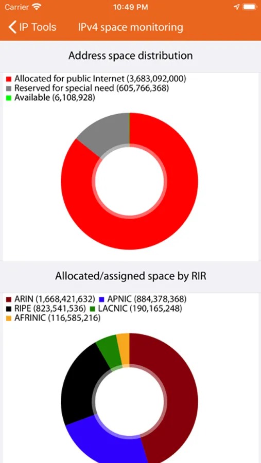 'IPv4 space monitoring' - presents an opportunity to present current distribution, utilization, and availability of public IP addresses between regional internet registries (RIRs).