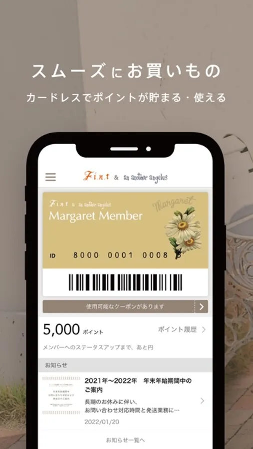 F i.n.t公式通販サイトでのお買い物はもちろん、お店でのお買い物時には会員証としても便利にご利用いただけます。