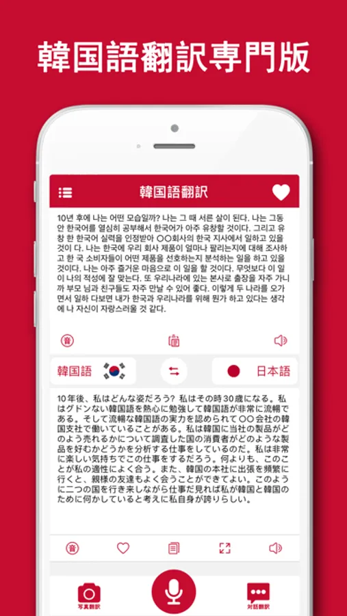 「韓国語翻訳」、専門の韓国語翻訳ソフトウェア。人工知能技術、正確な音声認識や翻訳撮影した画像認識に頼って、韓国語の翻訳を緩和します。また、よく使われる言語マニュアルや韓国語の翻訳辞書もあります。それは本当に韓国の語学学習、旅行に必要な翻訳ツールです!試してみて!