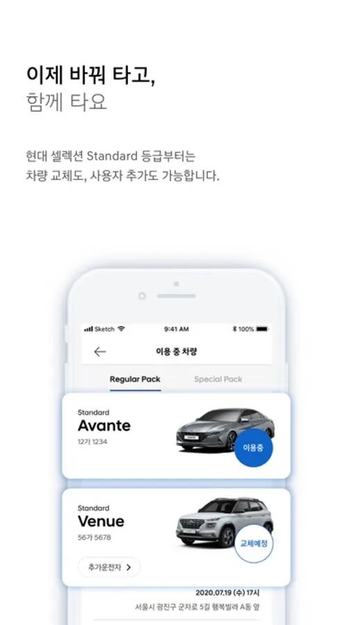 : 현대 셀렉션 Standard 등급부터는 차량 교체도, 사용자 추가도 가능합니다.