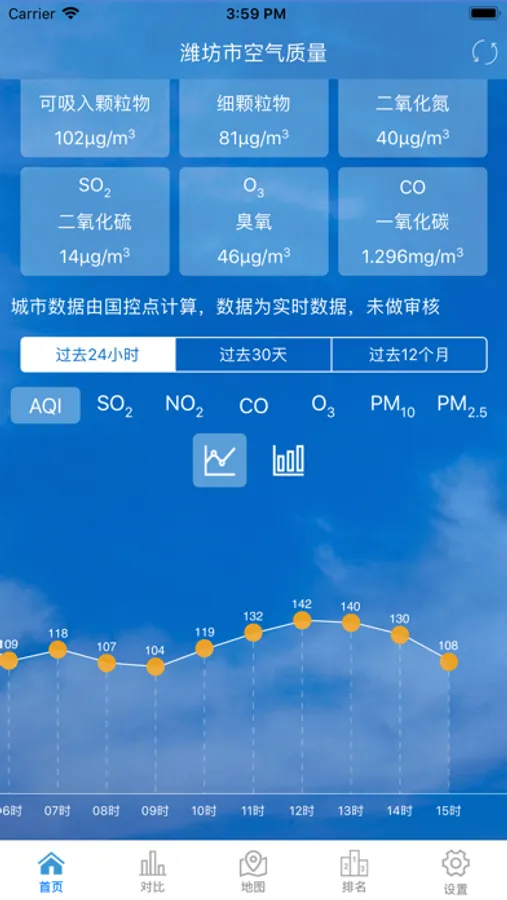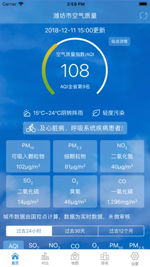 — 首页:可查看潍坊市空气质量和过去24小时、过去30天和过去12个月折线、柱状图;