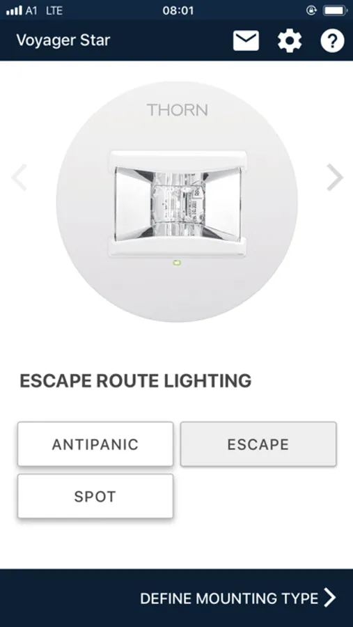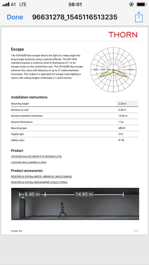 How many emergency luminaires are needed? And where do they have to be mounted? The Thorn VOYAGER Star app delivers the answers and completes the planning task within seconds: After only 3 clicks and the selection of the mounting height, the app displays the maximum distance from the wall to the luminaire and between 2 luminaires.