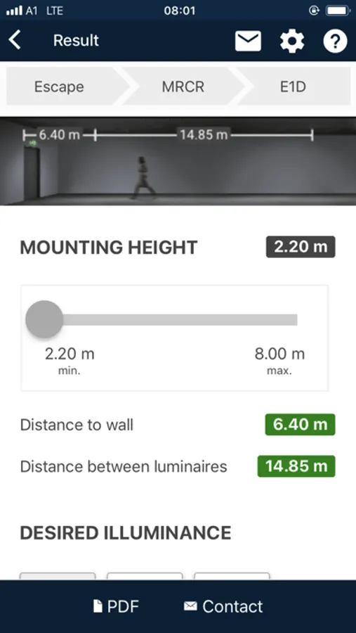- PDF generation to send the calculated distances between luminaires and the article numbers by E-mail.