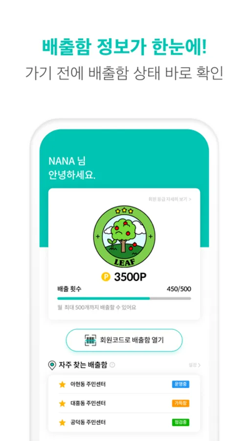배출함의 운영 여부, 배출함 비움 상태 등 배출함의 상태를 미리 확인할 수 있어요.