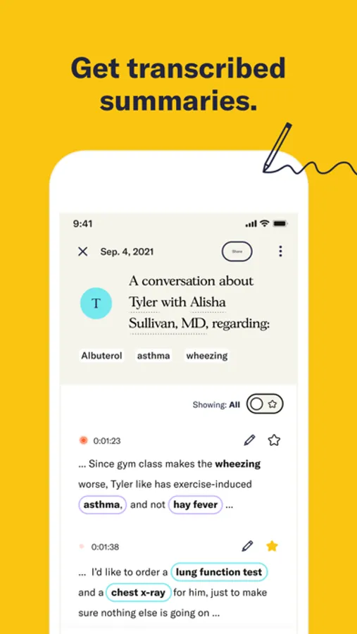 Securely share your conversation with family and others involved in your health. Keep everyone on the same page, even if they were unable to attend the appointment. Everyone can have more peace of mind knowing they can get a quick summary of what was said, and hear the information as if they were present.