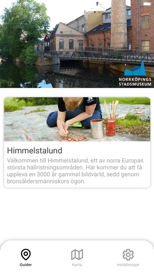 Norrköpings stadsmuseum ligger mitt i Norrköpings spännande industrilandskap, inrymt i gamla fabrikslokaler alldeles intill Motala ström. Här kan du vandra genom stadshistorien och se Norrköping växa fram till en textilstad. Vävstolar, spinnmaskiner och andra maskiner för textil produktion körs regelbundet än idag. Men museet fortsätter också utanför museibyggnaden. Följer du strömmen uppströms kommer du snart till Himmelstalund, ett av norra Europas största hällristningsområden med 3000-åriga hällristningar från bronsåldern. Här guidas du mellan hällarna och får uppleva en rik forntida bildvärld, en glimt av livet för länge länge sen.
