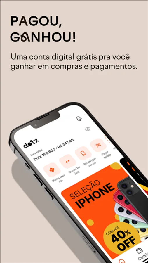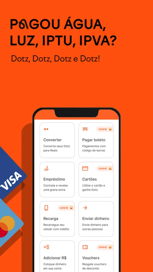 Sem taxas e sem esforço, no Super App da Dotz você consulta e troca seus Dotz, faz compras, pede seu cartão, movimenta dinheiro, faz pagamentos e transferências e ainda sai ganhando muitos Dotz!