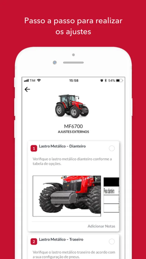 With the Massey Ferguson Easy Settings, the operator makes adjustments according to the machinery, to get the most out of it, the application provides: agility and information directed to you. You can save the manuals, access the manuals without internet, you have the step by step to make the adjustments and we still have the maintenance manual of your machinery. In a few steps you have your machinery adjusted and ready to produce your best.