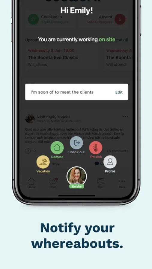 With the Availability function, you can easily notify your colleagues if you are available or not and can even notify that you, for example, are working from home. If you are ill, you can change your status in the app and the information is shared to everyone concerned.