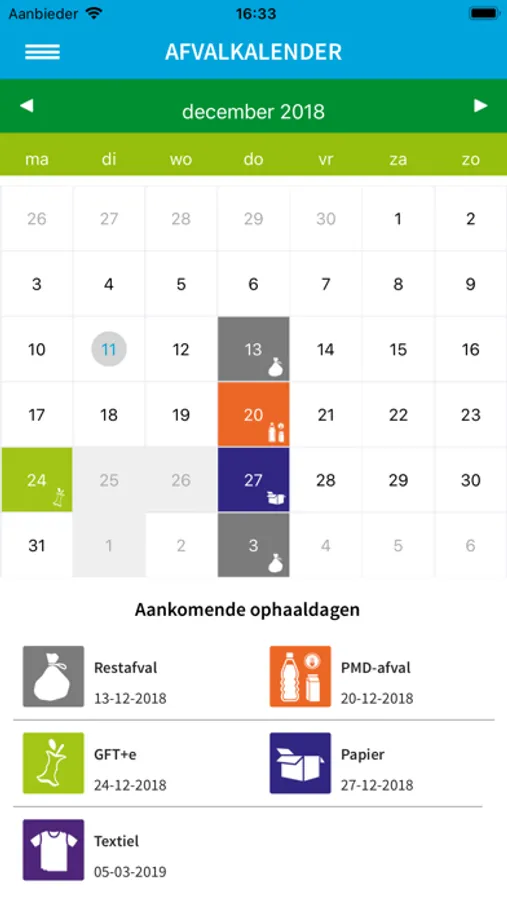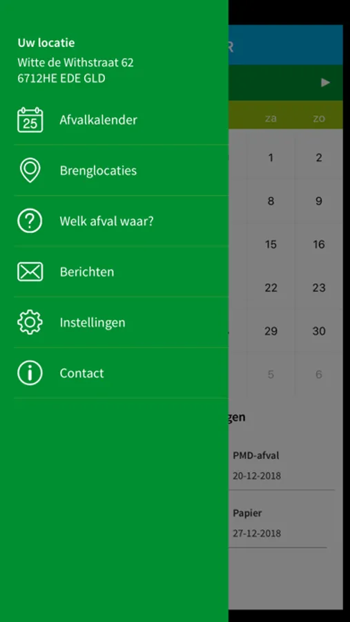 Voer uw postcode en huisnummer in om te zien wanneer bij u het afval wordt opgehaald. Bij Instellingen kunt u aangeven hoe laat u herinneringsberichten wilt ontvangen.