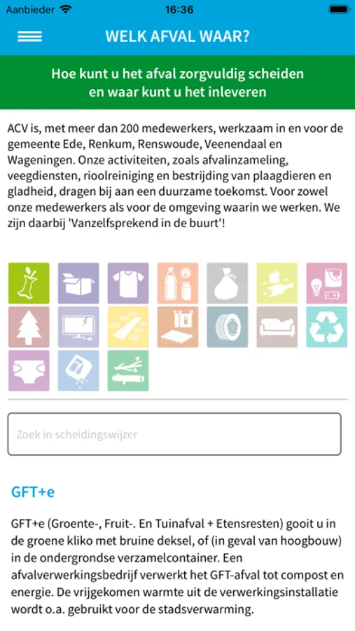 De ACV app is voor de inwoners van de gemeente Ede, Renkum, Renswoude, Veenendaal en Wageningen. Wilt u snel weten wanneer u de kliko of de PMD-zak aan de weg moet zetten, waar u de dichtstbijzijnde textielcontainer kunt vinden of ‘welk afval waar’? U vindt het in de ACV app.