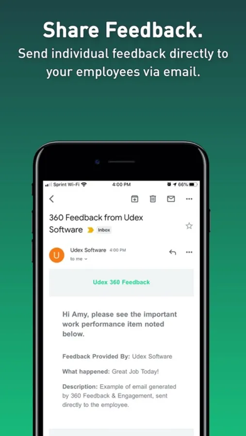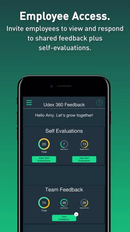 Udex 360 Feedback & Reviews helps everyone in an organization improve performance and productivity. It is a powerful communication tool for effective talent development, employee engagement, and more frequent performance reviews. The most useful performance reviews include specific examples to help employees clearly understand where they are exceeding or falling short of expectations. This app helps document these performance examples in the moment, making the reviews much easier and more meaningful for the employee. Plus, employees reflect on their own performance and capture opportunities for improvement, achievements, and accomplishments.