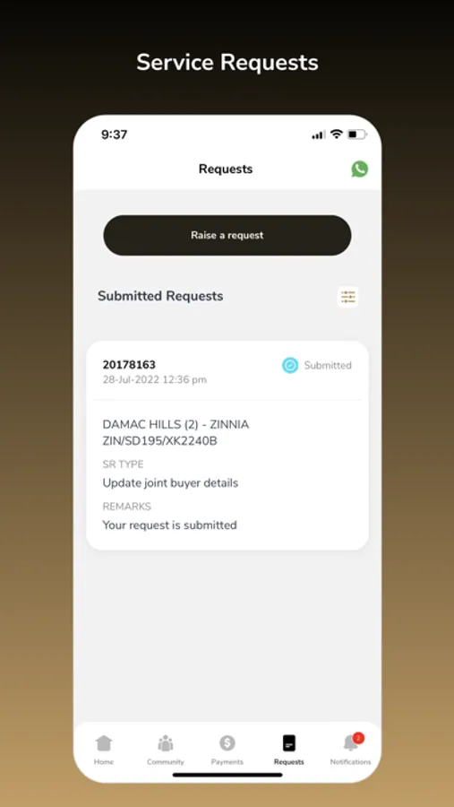 Raise various service requests like update your personal details, renewal of tenancy, proof of payment upload for property installments and service charges, NOC for Fit Out/Alterations with relation to your property and Access card requests for both Apartment/Villa’s.
