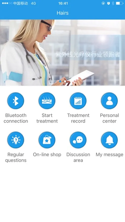 It is a software for controlling the hair loss therapy device, a tool for providing the scientific therapeutic regimen, recording treatment time & effect. It is a multi-user communication platform for treatment effect & experience. The user can use APP to connect the device through Bluetooth for hair loss therapy and online choosing therapeutic regimen (set up treatment time, treatment region, etc.)