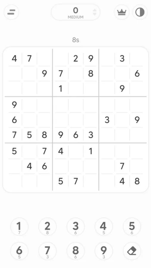 The user interface is minimal and fast - starting a new Sudoku or continuing right where you left off is just one click away. There are no loading screens. What is more, you do not have to worry about not finishing a Sudoku. If you are in a hurry, just hit back or leave the app in any other way and the app takes care of saving your progress seamlessly. This for all difficulty levels separately.