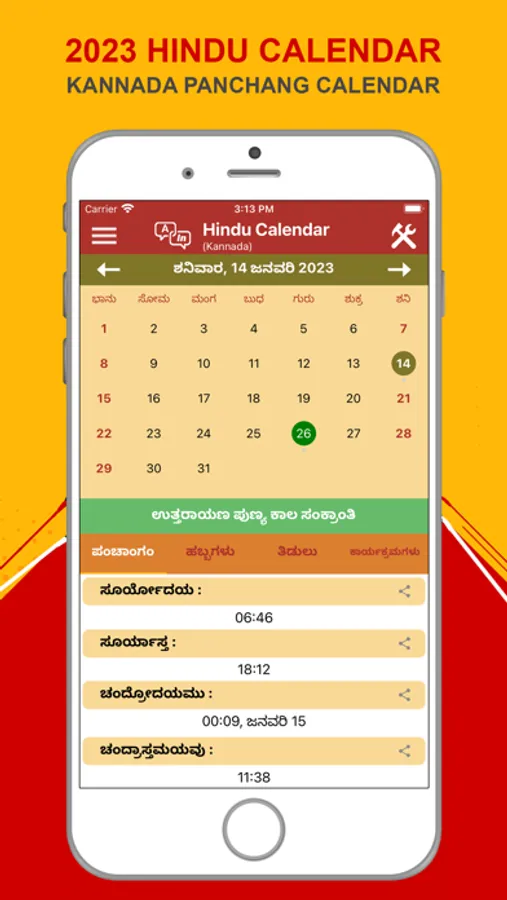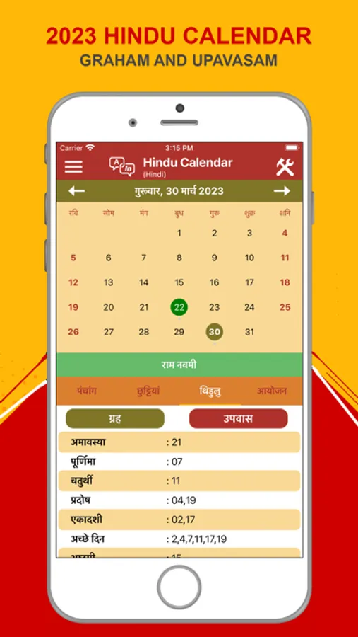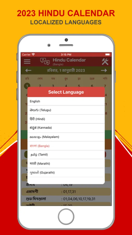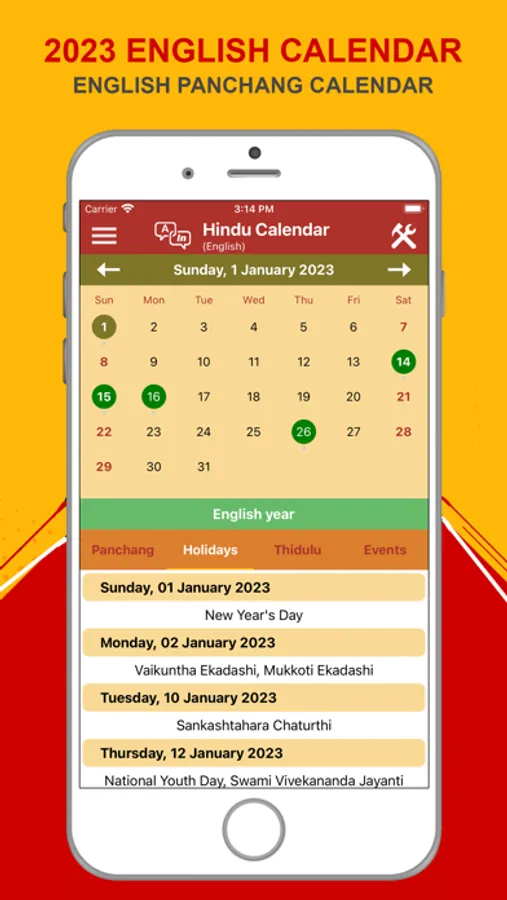 Introducing the 2023 Calendar Hindu Panchang app, your ultimate companion for Indian Calendars with language support of english, hindi, marathi, bangla, gujarati, kannada, malayalam and a wealth of information about festivals, holidays, panchangam, graham details, and events for 2023.