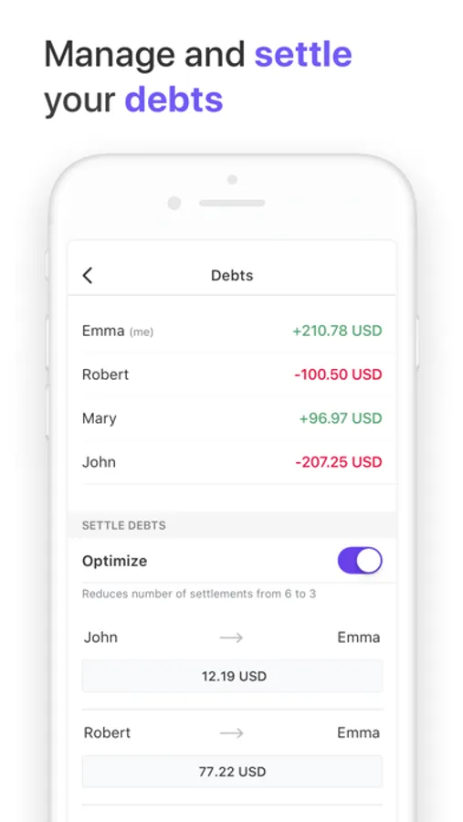 Just input bill details and Spend Together will do all the dirty work for you. It will calculate group debts and suggest optimal payments to settle them up.