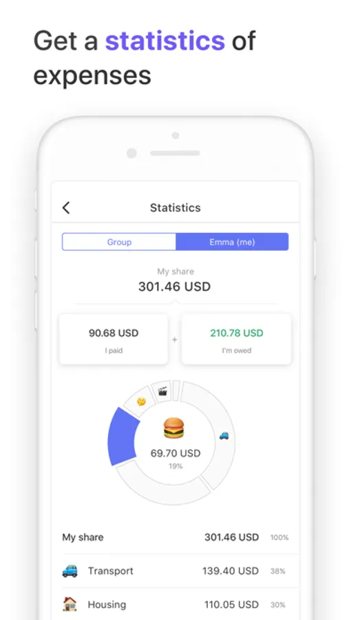 A comprehensive report will show your personal share in group expenses, so you can tell where your money goes (eg. on food, housing, transport, etc.).