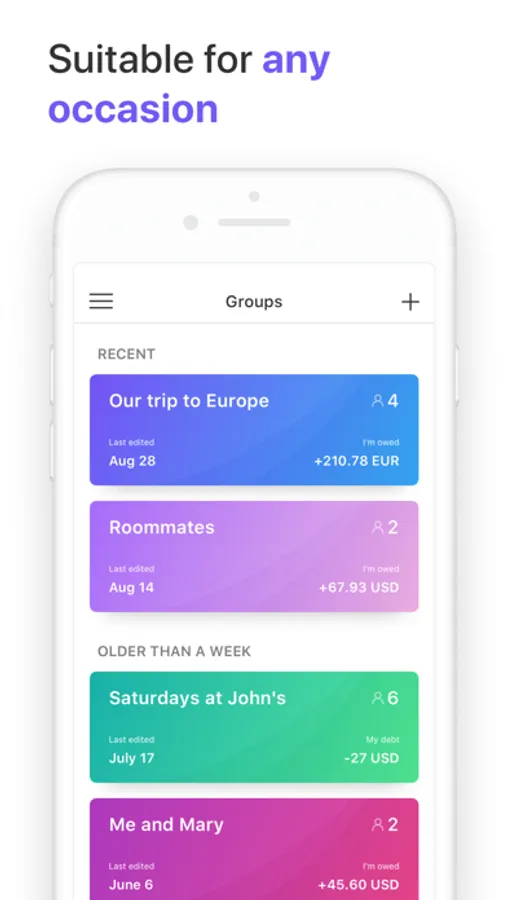 Spend Together supports all currencies and forms reports using up-to-date exchange rates. Add expenses and settle debts in any convenient currency.