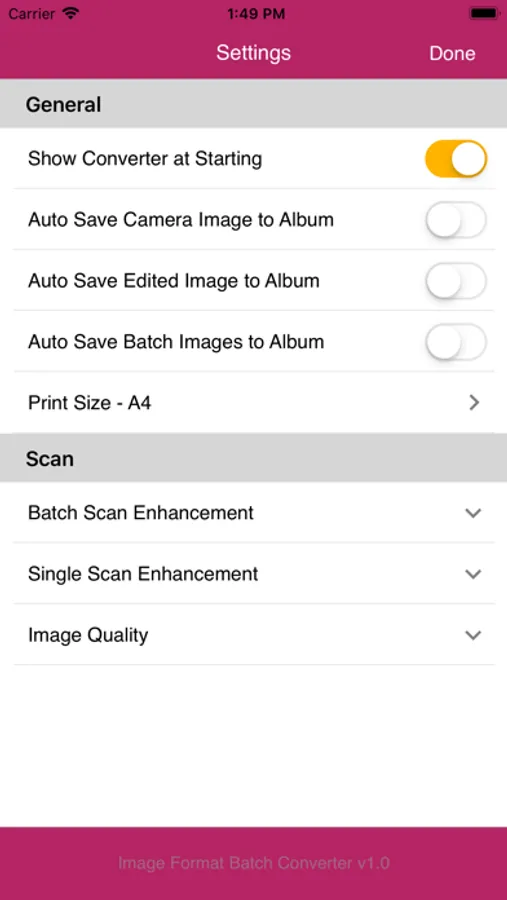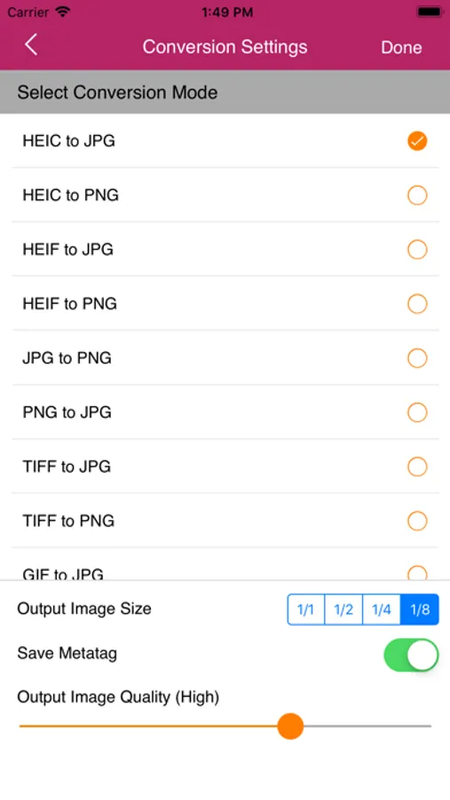 How to use : Select image file format and output image size in the conversion settings screen. From next screen select the images & convert.
