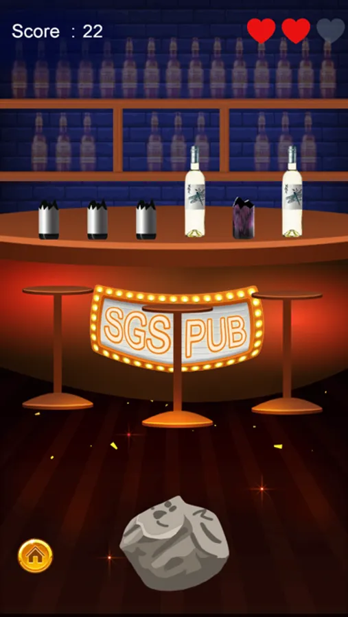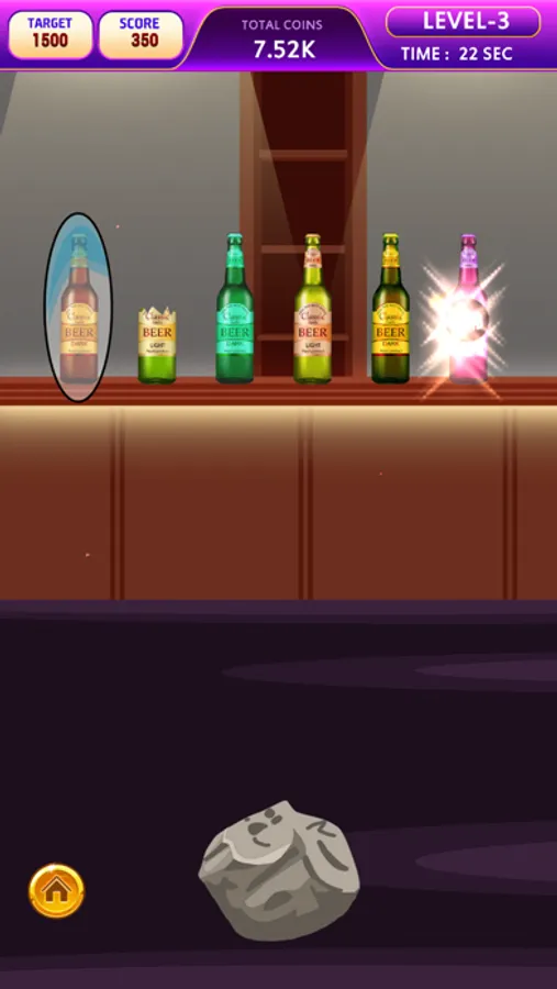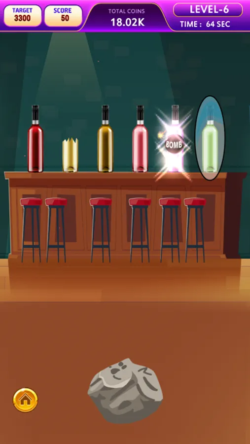 The gameplay is straightforward yet highly engaging. Crush bottles with a stone within a limited time and lives. Swipe your finger over the stone in different directions to break all the bottles placed on the table. Each round becomes tougher than the last, so react quickly and don't miss a single bottle. But beware! Some bottles are protected by a shield, requiring extra effort and precision to break. And keep your eyes peeled for random bombs – hitting one will cost you the game! Can you handle the pressure and come out victorious?