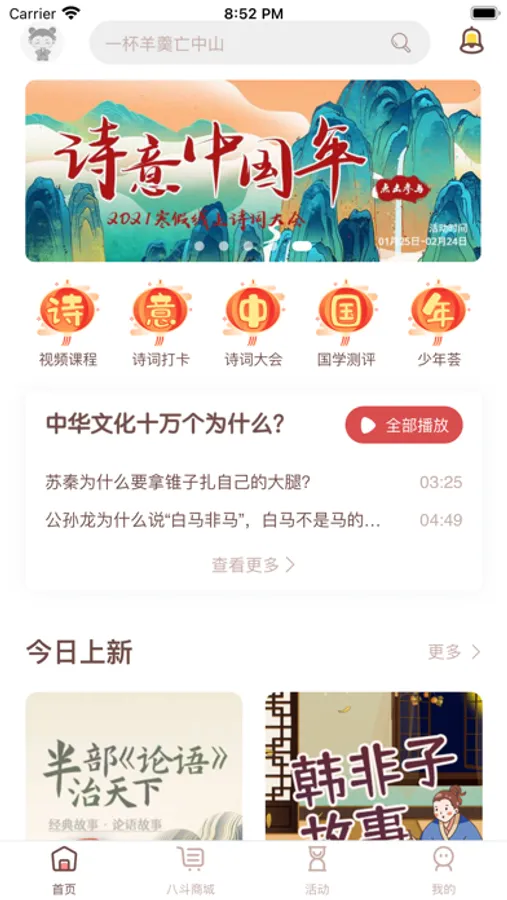 八斗国学是一款面向幼儿和青少年的国学教育APP,主要包括:
