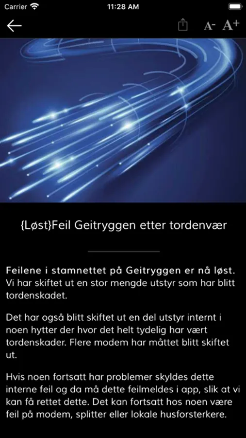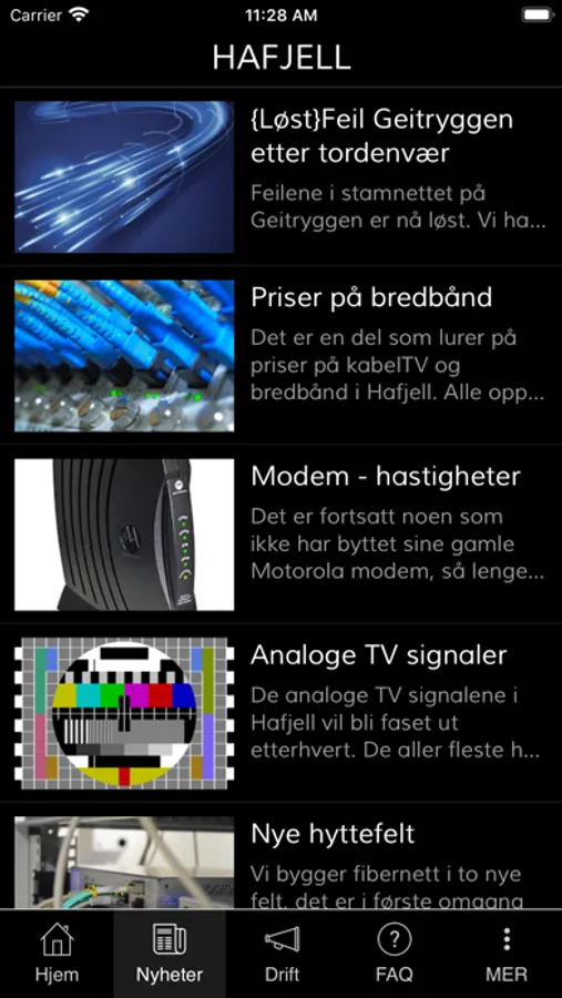 Hafjell er en app for deg som har tilknytning til de flere store hyttefeltene vi drifter på TV og bredbånd. Vi legger stadig ut nye bruksanvisninger i form av både tekst og video slik at du lett kan få hjelp. Samtlige spørsmål vi har mottatt fra kunder er besvart i en egen seksjon hvor du enkelt får svar på det du lurer på. Appen gir deg også det siste innen nyheter og direkte driftsmeldinger slik at du vet hva som skjer til enhver tid. Du kan enkelt bestille tjenester i appen og sende feilmelding om det skulle være noe feil med din løsning.