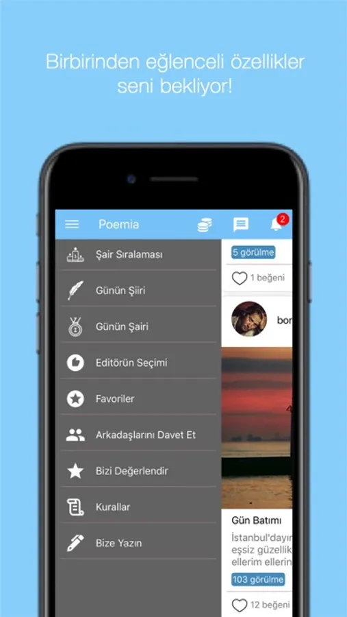 - Şiir paylaş ve kişiler şiirlerini beğendiğinde veya yorum yaptıklarında bildirim al.