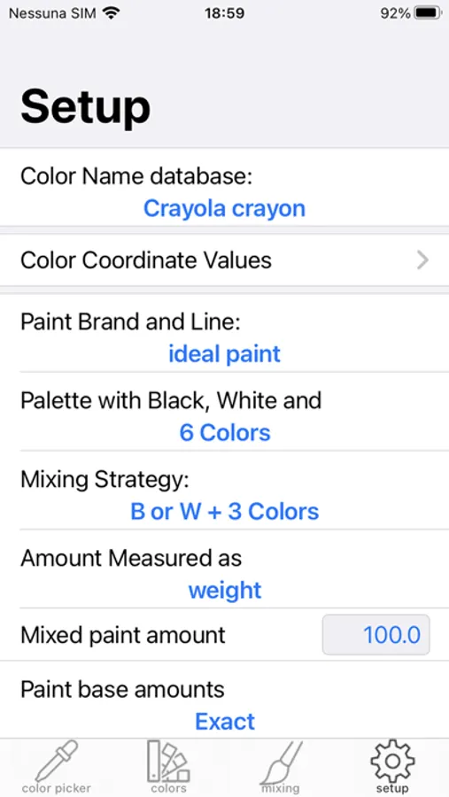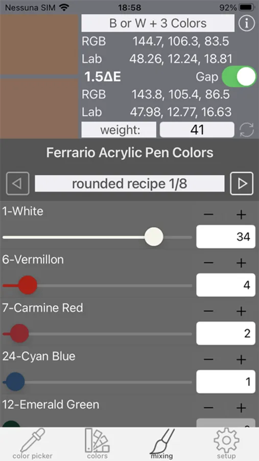 Please note that RPaintLite includes 8 paint bases of each Paint Line. These bases are Black, White and 3 or 6 colored ones, according to your Palette selection. These bases are fixed, and all color recipes use these and only these. Therefore, once you've selected your real Paint Line (Ferrario Acrylic Pen Colors in this free version), you can purchase the 8 bases and use them for all your paintings. The 6 colored bases of each Paint Line were optimized to cover the widest possible OPAQUE color space offering you as many as possible mixable colors. These tools use measurements of real paint spectra, so big part of the RGB/P3 space can be mixed, but not all RGB/P3 colors. This is not a limitation of the app, just physics. There are also many colors which can be mixed, even if they don't belong to the RGB/P3 color space (you can find these by manually varying the paint base amounts on the "mixing" page and reading the Lab values).