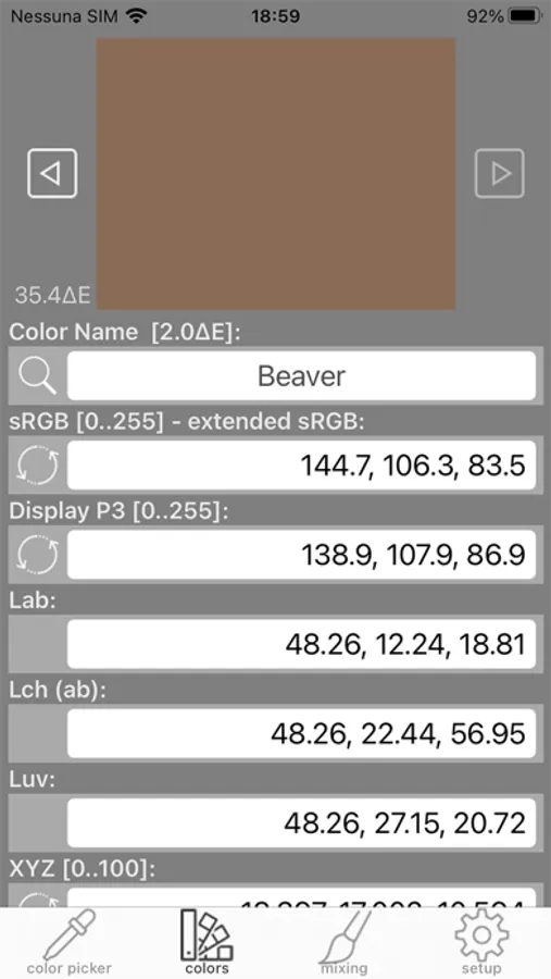 Color Coordinates can be converted from one space into another: sRGB, Display P3, CMYK, HSL, HSV/B, Lab, Lch-ab, Luv, Lch-uv, XYZ, xyY are available. The Munsell space is not available in the RPaintLite app.