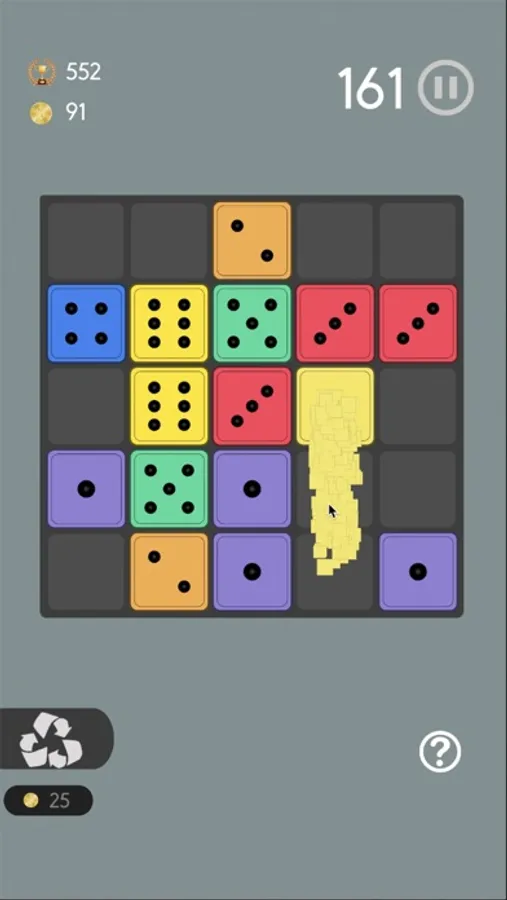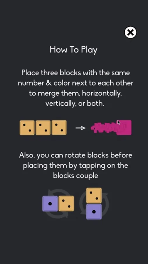 Place three blocks with the same number & color next to each other to merge them, horizontally, vertically, or both.