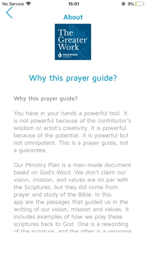 There is power in prayer, especially when many followers of Jesus pray together. The Greater Work is a prayer guide designed to help the Wildwood Church family pray through our Vision, Mission and Value. It features daily reminders, scriptures and devotional content, and even lets you see how many others are also praying that day. The Greater Work is a resource to equip followers of Jesus to live with gospel purpose.