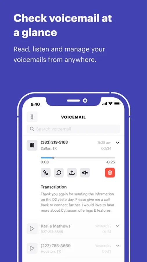 - Listen to voice messages and manage your voice mailbox from anywhere.