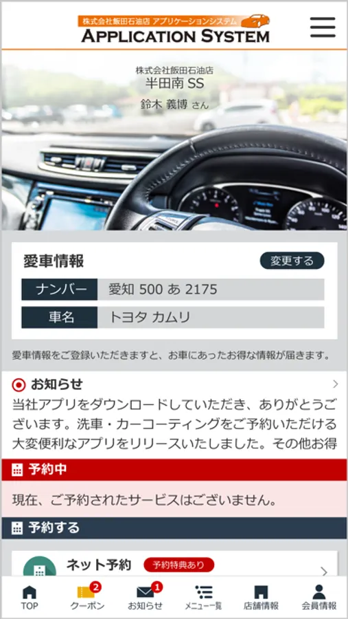当社の公式アプリ「飯田石油店 アプリケーションシステム」ではアプリで簡単にカーメンテナンスの予約や愛車情報の管理が可能です。その他、当店で利用いただけるお得なクーポンや各種メニューの割引情報を配信しております。