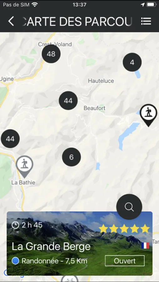 Depuis votre smartphone, en 1 clic, choisissez le parcours en fonction de votre pratique, vos envies (durée, niveau de difficulté, lieux..). Téléchargez le parcours sur votre téléphone chargé (pas besoin de réseau pour utiliser l’application) et c’est parti !