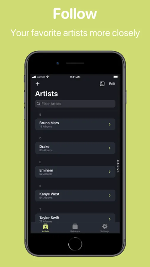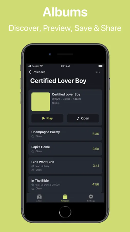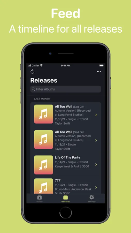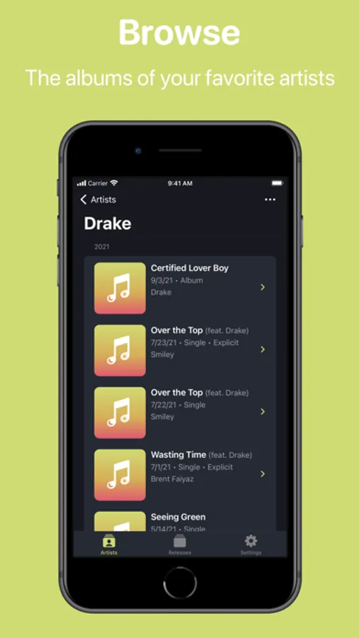 Seek out new releases from your favorite artists. Simple notifications mean you never need to worry about staying up-to-date with who’s releasing what. You’ll always be the coolest person in your friend group.