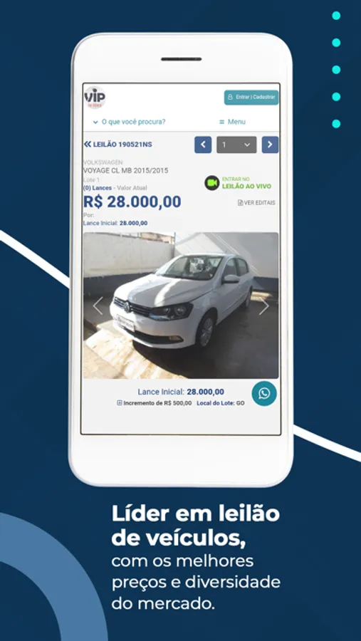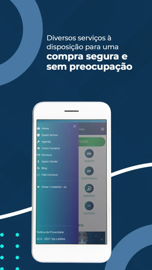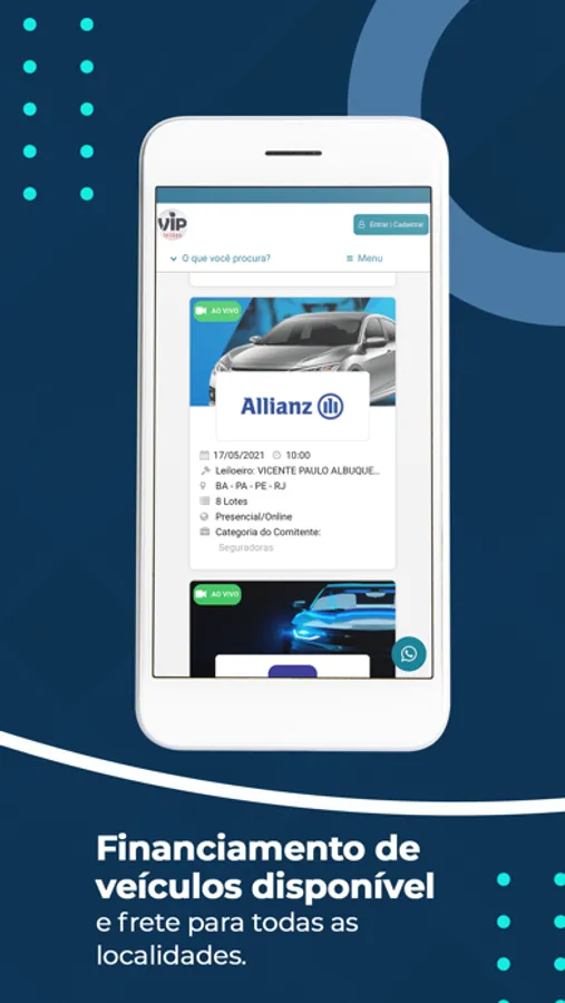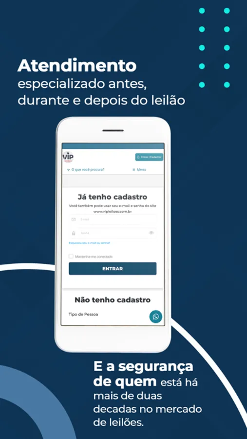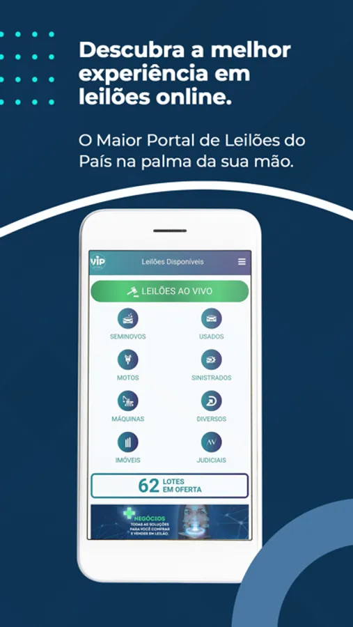 Aproveite todas as vantagens da Vip Leilões na palma da sua mão, com segurança e tecnologia.