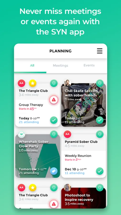 SYN is your sober network and life skills building an app for people who are abstinent from drugs and alcohol.