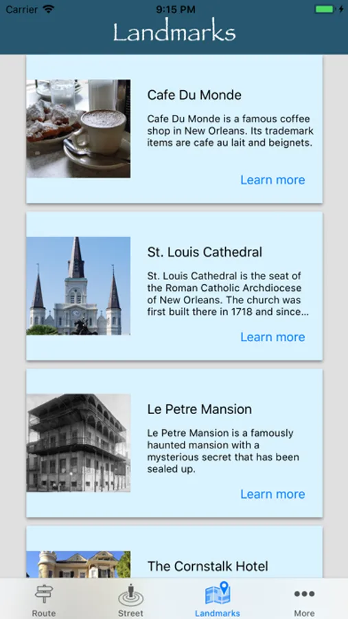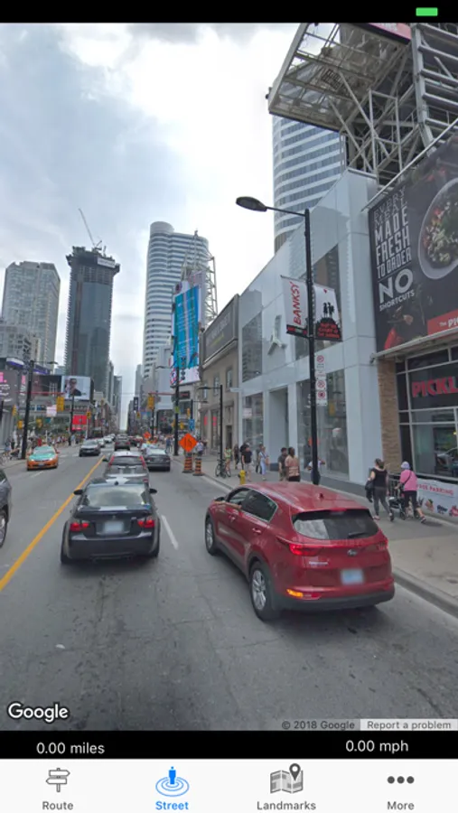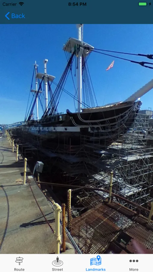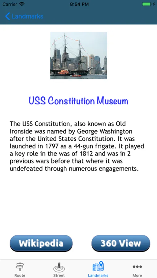 - A landmark view is available where you can see information on all the landmarks you passed as well as the ability to jump to a Wikipedia entry of the landmark as well as see a 360 panoramic view of the site using Google maps technology.
