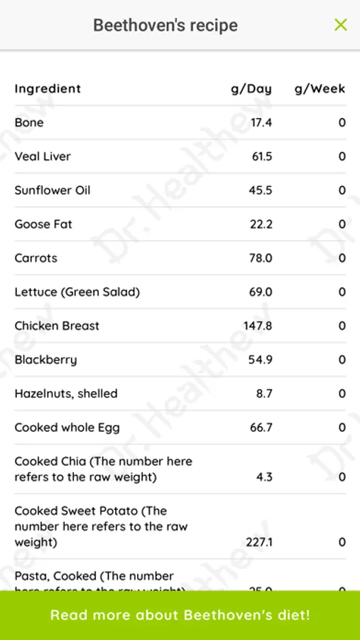 To create only ONE INDIVIDUALLY BALANCED RECIPE (which technically and scientifically can be used only for a week or maximum for a month), veterinarians and animal nutritionists would charge you something between 89 -179 €. The Good News is, Dr. Healthew is programmed and developed to do what a SUPER-EXPERT can do (even better though) for your dog’s nutrition without paying big bucks. From now on, you can create as many recipes as you want for your furry friend and do not need any veterinarian or animal nutritionist for it anymore.